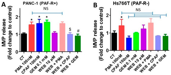 Previous studies, including ours, have shown that PAF-R antagonist attenuates PAF-R-mediated effects of various stimuli, including antitumor agents [7,29,30,31]. Thus, our next studies determined the effect of a PAF-R antagonist, WEB2086, on gemcitabine-induced MVP release. For this, PANC-1 and Hs766T (for control) cells were pretreated with WEB2086 (10 µM) for 1 h, followed by treatments with or without gemcitabine (0.1 mM), PMA (100 nM), or CPAF (100 nM), and incubated for 4 h. We observed that WEB2086 significantly attenuated gemcitabine- and CPAF-mediated, but not PMA-induced, MVP release in PANC-1 cells (Figure 3A). Importantly, WEB2086, which blocked CPAF-mediated MVP release, did not exert any effects on PMA-induced MVP release in Hs766T cells (Figure 3B). These findings further confirmed that PAF-R expression augments gemcitabine-mediated MVP release.