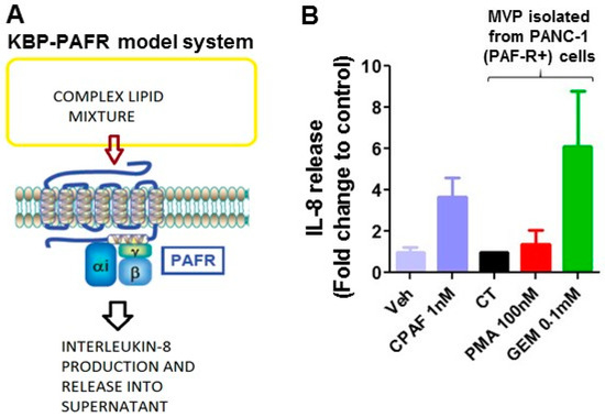 Given that pro-oxidative stressors, including UVB and therapeutic agents, generate PAF-R agonists, which can be quantitatively accessed via measuring IL-8 secretion as a surrogate marker [1,2,3,4,5,6,7], and that these PAF-R agonists are transported via MVPs [16,17], in the current study, we wondered if gemcitabine-released MVPs contain these metabolically labile PAF-R agonists. Using this well-established approach, our studies demonstrate that the lipid extracts from gemcitabine-treated MVPs from PANC-1 cells contain measurable amounts of PAF-R agonists, comparable to CPAF directly added to KBP cells, compared to MVPs from vehicle-treated cells.