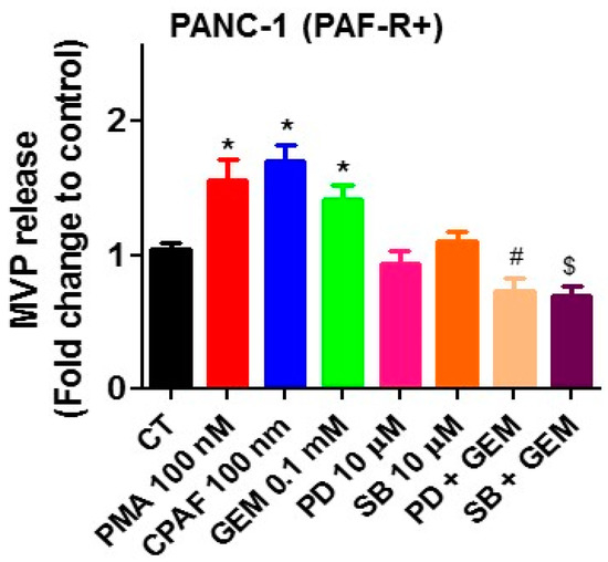 2.5. MAPK Pathway Mediates PAF-R-Dependent Gemcitabine-Induced MVP Release