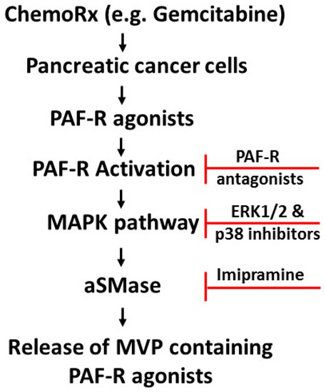 The current studies sought to determine the role and mechanism of PAF-R in gemcitabine-mediated MVP release in human pancreatic cancer cells. Our studies using PAF-R-expressing (PANC-1) and -deficient (Hs766T) cells demonstrate that gemcitabine induces MVP release in a PAF-R dependent manner, in a process blocked by PAF-R antagonist or acid sphingomyelinase (aSMase) inhibitor. Mechanistically, gemcitabine-induced MVP release was significantly attenuated by ERK1/2 and p38 inhibitors, indicating the role of MAPK pathway in PAF-R-dependent gemcitabine-induced MVP release.