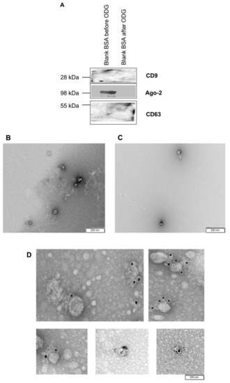 However, Western blot performed on blank BSA medium before and after OptiPrep™ density gradient ultracentrifugation with EV specific antibodies CD9 and CD63 showed no band formation (Figure 3A) while non-specific EV marker Ago-2 showed only a band for blank BSA medium before OptiPrep™ density gradient ultracentrifugation (Figure 3A). The absence of EVs specific antibody CD63 in blank BSA embryo culture medium (SOF+ITS+BSA) was finally confirmed by immunogold staining (Figure 3B,C). This indicated that blank BSA medium does not contaminate EV preparations with CD9 and CD63 positive EVs.