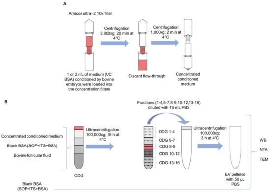 OptiPrep™ density gradient (ODG) ultracentrifugation was conducted as previously reported by Van Deun et al. [16]. Briefly, appropriate amounts of a homogenization buffer (10 mM Tris-HCl (Tromethamine - Hydrochloric acid), 1 mM EDTA (Ethylenediaminetetraacetic acid) and 0.25 M sucrose (pH 7.4)) and an iodixanol working solution were mixed in order to prepare 5, 10, 20, and 40% iodixanol solutions. The iodixanol working solution was made by adding a working solution buffer (60 mM Tris-HCl, 6 mM EDTA, 0.25 M sucrose (pH 7.4)) to a stock solution of OptiPrep™ (60% (w/v) aqueous iodixanol solution). Moreover, the gradient was prepared in a 16.8 mL open-top polyallomer tube (Beckman Coulter) by layering 4 mL of 40%, 4 mL of 20%, 4 mL of 10%, and 3.5 mL of 5% solutions on top of each other. Concentrated conditioned medium (as explained before, UC BSA culture medium conditioned by bovine embryos was collected on 8 dpi and pooled until 1 or 2 mL and subsequently concentrated) was overlaid onto the top of the gradient. Subsequently, the gradient was centrifuged at 4 °C for 18 h at 100,000× g (SW 32.1 Ti rotor, Beckman Coulter, Brea, CA, USA). Then, all 16 gradient fractions were divided into six samples by pooling the fractions 1–4, 5–7, 8–9, 10–12, 13–16 respectively. The pooled fractions were added to 14 mL PBS. Subsequently, the separate suspensions were centrifuged at 4 °C for 3 h at 100,000× g. The resulting pellets were resuspended in 50 µL PBS and stored at −80 °C for further EV characterization. Out of 16 layers of gradient fractions, EVs were mostly found in fraction 8 and 9 (as previously reported by Van Deun et al. [16]). For subsequent characterization of EVs from culture medium conditioned by bovine embryos, both fractions were pooled, diluted in PBS, centrifuged, resuspended, and stored as described above. All relevant data on the procedures of EV isolation and analysis have been submitted to EV-TRACK knowledgebase (http://evtrack.org/review.php, accessed on 30 August 2018) EV-TRACK ID: EV180007 (EV-METRIC 87%) [41]. This isolation procedure was repeated with blank BSA medium and bovine follicular fluid (positive control) (as detailed in Scheme. 1B)