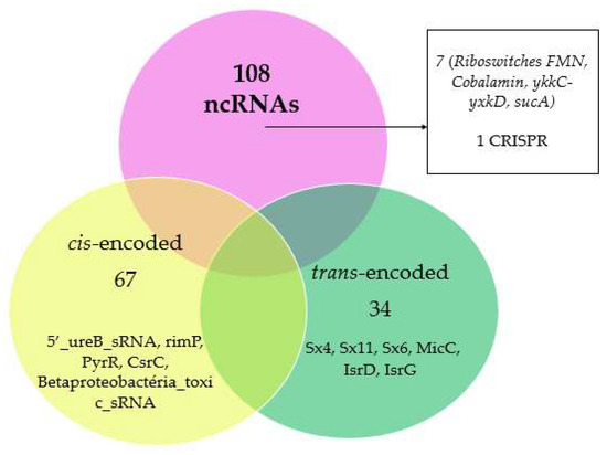 In Herbaspirillum seropedicae SmR1, the prediction of ncRNAs resulted in 108 ncRNAs, as shown in Figure 1. The sequence of ncRNAs predicted in H. seropedicae SmR1 by Infernal 1.1.1 is shown in Supplementary Material S2.
