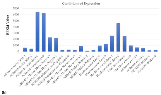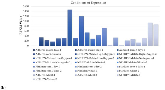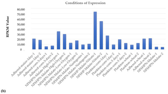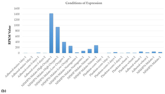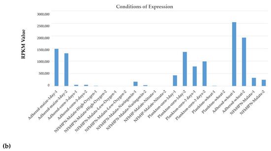 Figure 3. Visualization of the position and expression profile of mRNA 5′ UTR cspA in the genome of H. seropedicae SmR1. The sequence was located with the aid the Artemis program. The readings delineated within the pink rectangle refer to: (a) Levels of expression of mRNA 5′ UTR cspA in RNA-seq assays in H. seropedicae SmR1. In the colored part, the 11 analyzed experimental conditions are represented, where 1 and 2 represent d.a.i (days after inoculation); (b) the numbers represent the value of the gene expression in RPKM.