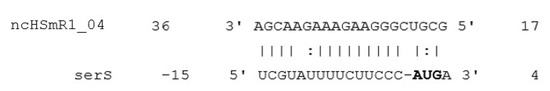 It is worth noting that the base pairing between the ncHSmR1_04 and the mRNA serS, occurs in the RBS region of the latter, as shown in Figure 9. This is a strong indication that the ncHSmR1_04 negatively regulate the conversion of seryl-tRNA synthetase. The 4.5S RNA is a common ncRNA in bacteria and its purpose is to the function of directing proteins containing signal peptide to the secretory apparatus, and thus form a signal-recognizing particle with the Fhh protein. In addition, the 4.5S RNA takes part in the conversation when interacting with the G stretch factor of G [51].
