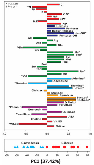 Variable and case plot of the principal component (PC) 1 of the principal component analysis (PCA) including all elemental, stoichiometric, and metabolomic data of the dataset of caterpillars (Caterpillar-Dataset). Only elemental, stoichiometric, and identified metabolomic variables are shown in the variable plot. Each bar represents the loading value for each variable on PC1. Elemental and stoichiometric variables are shown in red. Metabolite groups are shown in different colors: dark blue, saccharides (carbohydrates); green, amino acids; light blue, nucleobases/nucleosides; orange, organic acids related to tricarboxylic acid cycle; violet, phenolic compounds; and dark red, other. Caterpillars feeding on Pinus sylvestris ssp. iberica (C-iberica) are shown in blue triangles and caterpillars feeding on Pinus sylvestris ssp. nevadensis (C-nevadensis) are shown in red circles. Asterisks and crosses next to elemental, stoichiometric and metabolomic variables denote statistical significance (* p < 0.05) and marginal significance († p < 0.1), respectively.