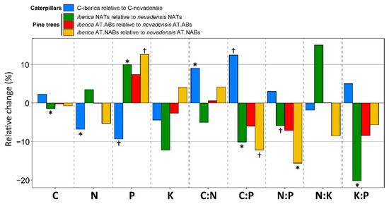 Relative difference (%) of elemental and stoichiometric variables between caterpillar groups (C-iberica relative to C-nevadensis) and between pine subspecies for each folivory level (iberica NATs relative to nevadensis NATs; iberica AT.ABs relative to nevadensis AT.ABs; iberica AT.NABs relative to nevadensis AT.NABs). Positive values indicate higher elemental concentration or stoichiometric ratio value in C-iberica or iberica trees while negative values indicate higher elemental concentration or stoichiometric ratio value in C-nevadensis or nevadensis trees. Asterisks and crosses denote statistical significance (* p < 0.05) and marginal significance († p < 0.1), respectively.