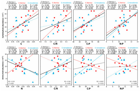 Pearson lineal correlations between total carbohydrate abundance versus C, C:N, C:P, and N:P ratios, and total amino acid abundance versus N, C:N, C:P, and N:P for both caterpillar groups (C-nevadensis and C-iberica) separately (n = 12) and together (n = 24). Coefficient of determination (R2), statistic Fisher value (F), and p value (p) are shown. Data corresponding to caterpillars feeding on Pinus sylvestris ssp. iberica (C-iberica) are shown in blue triangles and caterpillars feeding on Pinus sylvestris ssp. nevadensis (C-nevadensis) are shown in red circles. Lineal correlations for C-iberica and C-nevadensis are shown in blue and red, respectively. Lineal correlations for both C-iberica and C-nevadensis are shown in black. Correlations with P > 0.1 are represented by dashed lines.