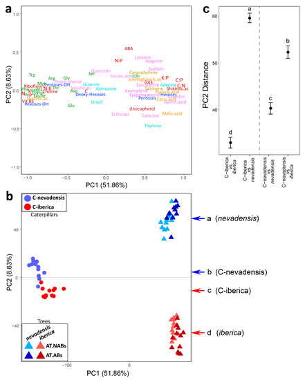 Variable (a) and case plot (b) of the principal component (PC) 1 vs. the PC2 of the principal component analysis (PCA) including all elemental, stoichiometric and metabolomic data of the dataset of caterpillars and pines (Pine-Caterpillar-Dataset). Only elemental, stoichiometric and identified metabolomic variables are shown in the variable plot (a). The location of a variable (element, stoichiometric ratio or metabolite) on the variable plot plane represents the loading value on PC1 vs. PC2 for such specific variable. Elemental and stoichiometric variables are shown in red. Metabolite groups are shown in different colors: dark blue, sugars (carbohydrates); green, amino acids; light blue, nucleobases/nucleosides; orange, organic acids related to tricarboxylic acid cycle; violet, phenolic compounds; dark red, other. Case plot (b) shows caterpillars feeding on Pinus sylvestris ssp. iberica (C-iberica) in blue circles and caterpillars feeding on Pinus sylvestris ssp. nevadensis (C-nevadensis) in red circles. Needle samples of attacked branches (AT.ABs) and non-attacked branches from attacked trees (AT.NABs) are shown in dark and light blue for Pinus sylvestris ssp. Iberica, and dark and light red for Pinus sylvestris ssp. nevadensis. Different letters next to each colored arrow denote significant difference between groups of samples after Tukey’s HSD post-hoc test (p < 0.05). One-way ANOVA plot (c) contrasting the metabolomic distances along the PC2 of the PCA between caterpillars and pines. Different letters indicate significant difference after Tukey’s HSD post-hoc test (p < 0.05). Not attacked trees are not represented in the PCA. Detailed discussion of the effects of the caterpillar on pines metabolism has been already published elsewhere [23,36].