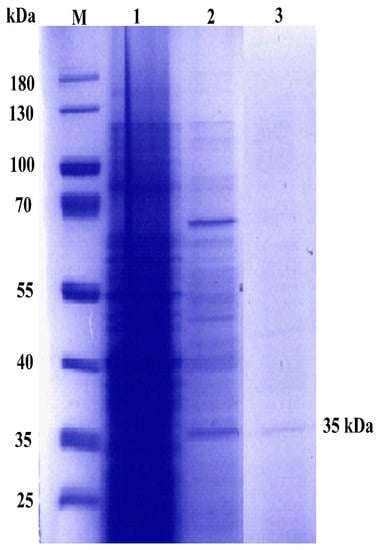 Figure 1. The 12% SDS-PAGE for crude and purified C12O from PcUFB2. Lane M = protein Marker, Lane 1 = crude cell extract; Lane 2 = anion exchange fractions; Lane 3 = purified C12O from gel filtration fractions showing a band at 35 kDa.