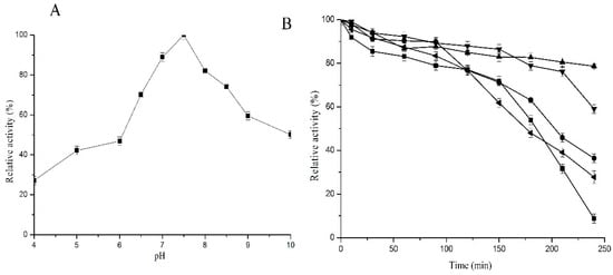 Figure 2. Optimum pH and pH stability of C12O from PcUFB2. (A) 0.13 µg of enzyme incubated at different pH and assayed for enzyme activity; (B) pH stability profile of C12O at pH 4 (■), pH 6 (●), pH 7(▼), pH 8 (▲), and pH 10 (◄).