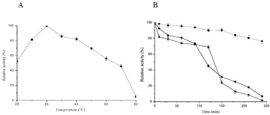 Figure 3. Optimum temperature and temperature stability of C12O from PcUFB2. (A) 0.13 µg of enzyme incubated at a different temperatures and the activity was measured at optimum pH (7.5); (B) The temperature stability of C12O at 30 °C (■), 50 °C (●), and 70 °C (▲).