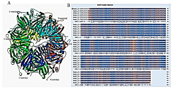 Figure 4. The model constructed by homology modeling at a SWISS-MODEL workspace using homogentisate 1,2-dioxygenase (H12D) from Pseudomonas chlororaphis as the template. (A) The predicted tertiary structure of H12D from PcUFB2 deduced from 3zds.1.A; (B) Homology alignment of probable H12D from PcUFB2 (Model_1) with H12D from Pseudomonas chlororaphis (3zds.1.A).
