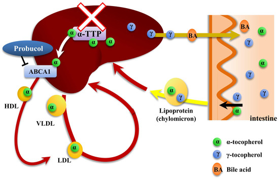 Probucol, 4,4′-[(1-methylehylidene)bis(thio)]bis [2,6-bis(1,1-dimethylethyl) phenol], is a drug used for the treatment of hyperlipidemias [54], since it inactivates ABCA1-mediated cholesterol efflux [55,56]. It may be considered that inhibition of ABCA1, a downstream molecule for α-tocopherol efflux from liver cells [17,18], induces α-tocopherol deficiency in circulation.