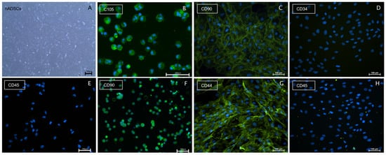 Characterization of human ADSC cultures. Scale bars in (A–H) represent 100 µm: (A) a bright field image of an ADSC culture in vitro at 80% confluency; (B–H) representative immunostainings of human ADSCs cytospins (B,E,F) or grown in vitro cultures (C,D,G,H); (B) CD105 positive immunostaining of ADSCs cytospin; (C) CD90 positive immunostaining of grown ADSCs cultures; (D) CD34 negative immunostaining of grown ADSCs culture; (E) CD45 negative immunostaining of ADSC cytospin; (F) CD90 positive immunostaining of ADSC cytospin; (G) CD44 positive immunostaining of ADSCs in culture; and (H) CD45 negative immunostaining of ADSCs cultures.