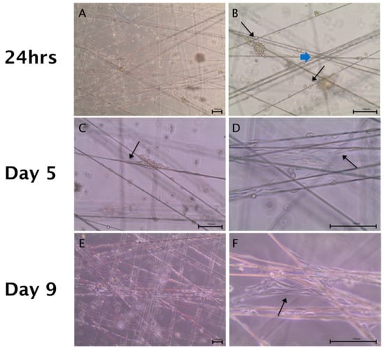 ADSCs and Schwann cells in co-culture on a spider silk scaffold from day 1 to day 9. Scale bars in (A–F) represent 100 µm. Bright field images illustrate co-cultures in low (A,C,E) and high (B,D,F) magnifications, respectively. (A,B) On day 1, cell attachment on the silk was observed (indicated by black arrows in (B)). (C,D) After 5 days in culture, cells had elongated along the silk and accumulated at fiber crossing (indicated by the blue arrow in (B)), resulting in a 3-dimensional organization of the cells. (E,F) After 9 days, cells were distributed along the silk fibers which were used as guidance structures and started to bridge gaps between the silk fibers (indicated by black arrows in C,D,F).