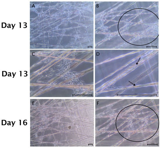 ADSCs and Schwann cells in co-culture on a spider silk scaffold from day 13 to day 16. Scale bars in (A–F) represent 100 µm. Bright field images illustrate co-cultures in low (A,C,E) and high (B,D,F) magnifications, respectively. (A–D) By day 13, cells had distributed equally along the silk fibers and confluent cell layers were observed at fibers crossing (indicated by the black circle in (B)); (D) cells migrating along the silk showing long shaped morphology (indicated by black arrows in (D)). (E,F) After day 16, an almost confluent layer of cells was formed over the mesh (shown in the black circle in (F)).