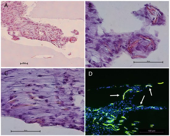 Illustrations of Schwann cells and ADSC co-cultures on spider silk: (A–C) Hematoxylin & Eosin staining showing cells equally distributed around the silk fibers; and (D) immunostaining with autofluorescence of the silk (green) and cell nuclei stained with DAPI (blue). Cells attached to the silk fibers are marked by the white arrows.