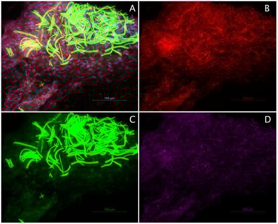 Characterization of Schwann cells and ADSC co-cultures on spider silk by immunohistochemistry. Scale bars in (A–D) represent 100 µm: (A) Representative image of paraffin sections stained for the characteristic Schwann cell marker S-100 (red), ADSC marker CD 90 (green), vimentin (purple), and DAPI (blue); (B) S-100 staining; (C) CD90 staining with strong autofluorescence of the spider silk fibers; and (D) vimentin staining.
