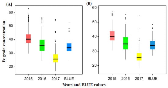 (A) Grain iron concentration (µg·g−1) in all wheat genotypes of the whole panel for the years 2015, 2016 and 2017 and BLUE values. (B) Grain iron concentration (µg·g−1) for wheat genotypes in the subpanel for the years 2015, 2016 and 2017 and BLUE values.