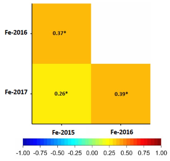 Pearson correlation between Fe grain concentrations (µg·g−1) in the years 2015, 2016 and 2017. The degree of significance indicated as * p ≤ 0.05.