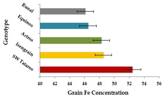 The heritability of Fe concentration among the years was moderate equaling H2 = 0.59, suggesting a quantitative nature of inheritance and a considerable environmental influence on the expression of the trait. Gorafi et al. [] reported a broad-sense heritability value of Fe grain concentration in synthetic hexaploid wheat germplasm of 0.80. Khokhar et al. [] reported broad-sense heritability equal to 0.75 for Fe grain concentrations in field-grown Indian wheat.