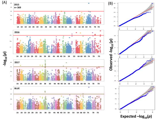 (A) Summary of genome-wide association scans for the whole panel of wheat genotypes (369) which were analyzed by using the 90K iSELECT Infinium array and the 35K Affymetrix SNP array for each year (2015/2016/2017) and BLUEs. The horizontal red color line indicated the threshold of −log10 (p-value) of 3. (B) Quantile-quantile scale representing expected versus observed −log10 (p-value).