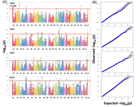 (A) Summary of genome-wide association scans for the subpanel of wheat genotypes (183) which analyzed by using the 90K iSELECT Infinium array, the 35K Affymetrix SNP array and the 135K Affymetrix SNP array for each year (2015/2016/2017) and BLUEs. The horizontal red color line indicated the threshold of −log10 (p-value) of 3. (B) Quantile-quantile scale representing expected versus observed −log10 (p-value).