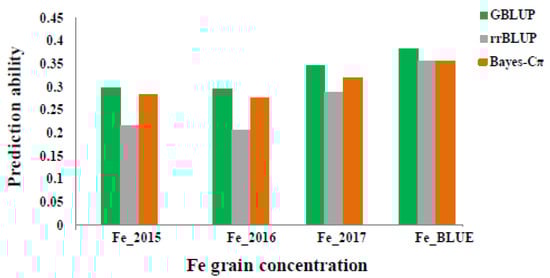 Prediction ability values for grain Fe concentration (µg·g−1) according to different years (2015, 2016 and 2017) and BLUEs by using three different statistical models: GBLUP, rrBLUP and BayesC.