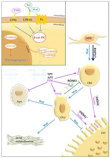 Figure 1. Top left: Wnt binds to the Frizzled receptor (Fz) and the LRP5/6 co-receptor. LRP5/6 and Fz deactivate the β-catenin destruction complex, which leads to accumulation of β-catenin. β-catenin translocates into the nucleus, where it regulates transcription of Wnt target genes with TCF/LEF. Sclerostin inhibits binding of Wnt to LRP5/6. PTH binds to LRP6 and causes an Wnt-independent deactivation of the β-catenin destruction complex. bottom: Wnt promotes the osteoblastic lineage and inhibits osteoclastogenesis and apoptosis. BMP is a strong promoter of osteoblastic differentiation. PTH acts through the PTH1R receptor in the osteoblastic lineage and has an inhibiting effect on sclerostin expression. APT and TPT work through selective activation of PTH1R activation. ROMO binds sclerostin. DENO binds RANKL and prevents RANK activation. Apo, Apoptosis; APT, Abaloparatide, parathyroid hormone-related protein analogue; β-cat. DC, β-catenin destruction complex, targets β-catenin for ubiquitination and subsequent degradation in the proteasome; BMP2/7, Bone morphogenetic protein 2 and 7; DENO, Denosumab, monoclonal antibody against RANKL; ECM, Extracellular matrix; Fz, Frizzled receptor, G-protein coupled receptor, target for Wnt; LRP5/6, Low-density lipoprotein receptor-related protein 5 or 6; LRP6, Low-density lipoprotein receptor-related protein 6; MSC, Mesenchymal stem cell; Obl, Osteoblast; Ocl, Osteoclast; Ocy, Osteocyte; PTH, Parathyroid hormone; TPT, Teriparatide, peptide Fragment of PTH; PTH1R, parathyroid hormone 1 receptor; RANK, Receptor Activator of NF-κB; RANKL, Receptor Activator of NF-κB Ligand; ROMO, Romosozumab, monoclonal antibody against sclerostin; Scl, Sclerostin; TCF/LEF, T cell factor/lymphoid enhancer factor; Wnt, Wingless-related integration site/Wnt signalling pathway.