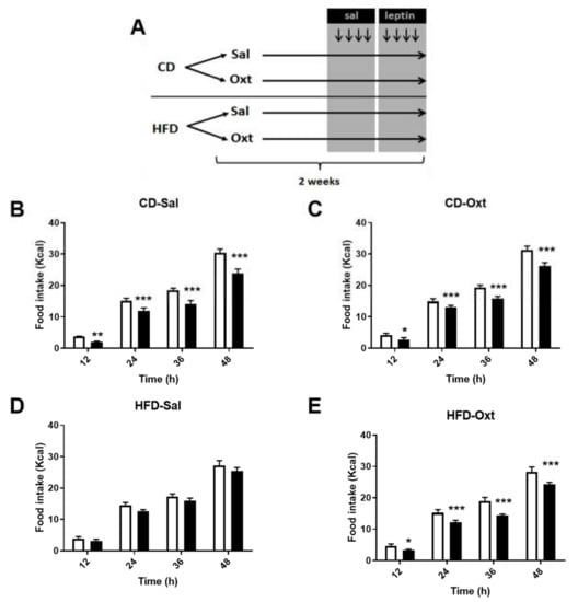 Acute leptin effects on food intake. (A) Experimental design described in Material and Methods. Mice were fed a chow diet (CD) or a high fat diet (HFD) during 10 weeks. The last two weeks, mice were infused subcutaneously with the vehicle (saline, Sal) or oxytocin (Oxt, 50 μg/day). At days 10–13, they were IP injected twice per day (7:00 and 19:00) with saline (days 10–11) and leptin (days 12–13). (B–E) Cumulative food intake at the indicated timings in the different groups. White bars, saline; black bars, leptin (1.5 mg/kg). Statistical significance was analyzed by two-way repeated measures ANOVA with an FDR Benjamini and Hochberg’s post-hoc test, * p < 0.05, ** p < 0.01, *** p < 0.001.