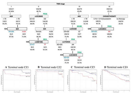 Czech cohort. The five-year OS analysis resulted in four terminal nodes. Variables determining the structure of the tree included TNM stage, age, sex, chemotherapy, and five SNPs—rs3087386, rs3218649, rs3218651, rs545500, and rs5744934. Among the stage I CRC patients, the subsequent split showed interactions between age and sex. In stage II, the carriers of GC+CC genotypes in POLQ rs3218649 were associated with a better prognosis. However, the GG genotype in females showed almost similar OS prognosis and an even better prognosis when in combination with CC+CT genotypes in REV1 rs3087386 (CC+CT 96.4% vs. TT 65.2%). In stage III, the subsequent split was age, which was seen to interact with GG+GC genotypes in MUS81 rs545500 and AG+GG genotypes in POLE rs5744934 (AG+GG 94.9% vs. AA 68.1%). The AA genotype of POLE gene further interacted with POLQ rs3218649 (GG+GC genotypes 75.1% vs. CC genotype 32.5%). In stage IV, chemotherapy was the next most significant factor and the level of OS increased when in combination with the rs3218651 variant in POLQ gene (AG+GG 65.6% vs. AA 43.2%). The structure of the tree and corresponding survival curves from terminal nodes are presented in Figure 1.