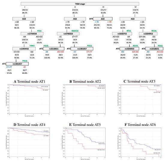 Austrian cohort. The final tree structure contained six terminal nodes and included nine variables (age, TNM stage, and seven SNPs—rs1381057, rs2283432, rs3204953, rs3218651, rs4796033, rs5030755, and rs5744934). Among CRC patients at stage I, age as the subsequent split showed interactions with the AA genotype in POLE rs5744934 and CC+CG genotypes in FANCI rs2283432. The interaction was concluded by CT+TT genotypes in POLQ rs1381057 (CT+TT 97.6% vs. CC 84.8%). In stage II, age was the next most significant factor, and the level of OS increased when in combination with the CC genotype in RAD51D rs4796033 and the AA genotype in POLQ rs3218649 (AA 100% vs. AG+GG 92.9%). Carriers of the CT+TT genotype in RAD51D rs4796033 showed a better prognosis in combination with the CC genotype in POLQ rs1381057 (CC 100% vs. CT+TT 77.8%). In stage III, age was the most significant factor for OS. In stage IV, age was further associated with three SNPs (RPA1 rs5030755 combined with REV3L rs3204953 as a terminal node: GG 44.4% vs. GA+AA 27.3%; and REV3L rs3204953 combined with POLQ rs3218651 as a terminal node: AA 24.2% vs. AG+GG 0%). The structure of the tree and corresponding survival curves from terminal nodes are presented in Figure 2.