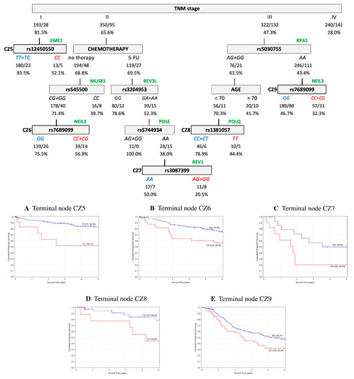 Czech cohort. Regarding the five-year EFS, the final tree structure contained five terminal nodes and included 11 variables (age, TNM stage, chemotherapy, and eight SNPs—rs12450550, rs1381057, rs3087399, rs3204953, rs5030755, rs545500, rs5744934, and rs7689099). Among CRC patients at stage I, the subsequent split was for EME1 rs12450550 (TT+TC 83.5% vs. CC 52.1%). In stage II, chemotherapy was the first split, when patients with no treatment and those with 5-FU-based therapy without oxaliplatin showed almost the same prognosis level. Patients without treatment had a better prognosis when associated with CG+GG genotypes in MUS81 rs545500 in combination with the GG genotype in NEIL3 rs7689099 (GG 75.5% vs. CC+CG 56.9%). Patients treated only with 5-FU had a better prognosis when in association with the GG genotype in REV3L rs3204953 (GG 78.6% vs. GA+AA 52.3%). On the other hand, the negative association for rs3204953 with the prognosis level was further worsened by the AA genotype in POLE rs5744934 and AG+GG genotype in REV1 rs3087399 (AA 50.0% vs. AG+GG 20.5%). In stage III, the subsequent split AG+GG genotype in RPA1 rs5030755 was seen to interact with patients under 70 years of age and the CC+CT genotype in POLQ rs1381057 (CC+CT 78.9% vs. TT 44.4%). Patients with the AA genotype for rs5030755 were further associated with a worse prognosis level in combination with the wild type allele C in NEIL3 (GG 46.7% vs. CC+CG 32.3%). The structure of the tree and corresponding survival curves from terminal nodes are presented in Figure 3.
