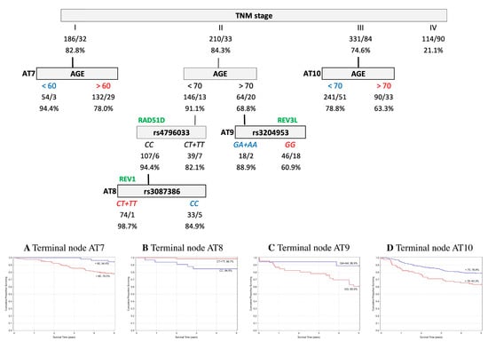 Austrian cohort. The final tree structure contained four terminal nodes determined by five variables (age, TNM stage, and three SNPs—rs3087386, rs3204953, and rs4796033). In stage I, a better EFS prognosis was shown within patients under 60 years of age. In stage II, the subsequent split was age, which was seen to interact with the CC genotype in RAD51D rs4796033 and CT+TT genotypes in REV1 rs3087386 (CT+TT 98.7% vs. CC 84.9%). Furthermore, GA+AA genotypes in REV3L rs3204953 showed a better EFS prognosis in stage II patients over the age of 70 (GA+AA 88.9% vs. GG 60.9%). In stage III, the subsequent split showed an interaction with age only. The structure of the tree and corresponding survival curves from terminal nodes are presented in Figure 4.