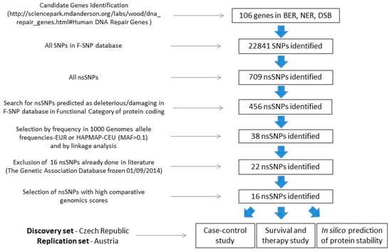 After this selection, sixteen nsSNPs in 12 DNA repair genes complied with the required selection criteria. The workflow for the selection is depicted in Figure 5.