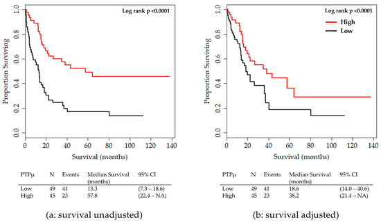 Kaplan Meier Plot for overall survival by PTPµ high versus low staining for all glioma patients. (a) Unadjusted overall survival. (b) Overall survival adjusted by sex, tumor grade, age group, and IDH1 mutation status. Median survival with 95% Confidence Intervals for each group are shown below each plot.