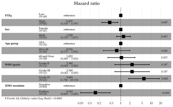 Multivariable Cox proportional hazards regression survival models were generated to investigate the effects of PTPµ, sex, age, grade, IDH1 mutation status, and other parameters on overall survival. Results of the final model are summarized in the Forest Plot shown in Figure 3. Sex, age, WHO tumor grade, and IDH1 mutation status were all included in the final model since all four characteristics are well validated prognostic factors in glioma as mentioned above [4,5,6,22]. PTPµ high staining resulted in a significantly decreased hazard compared to PTPµ low staining (Figure 3). Males showed a slightly increased hazard compared to females, but this difference was not significant. Similarly, there were no significant differences in the hazard of death among patients in the different age groups. Patients with grade IV tumors had significantly increased hazard ratios relative to patients with lower grade tumors. Consistent with previous studies, patients with mutant IDH1 had a significantly reduced hazard of death relative to wild-type IDH1 glioma patients (Figure 3).