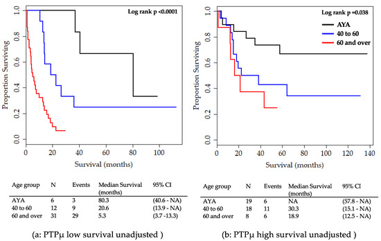 The distribution of age groups was different for patients with PTPµ high staining; of the 45 high, 19 were AYA, 18 were aged 40 to 60, and only eight were aged 60 and over. As with PTPµ low biomarker staining, the unadjusted overall survival for patients in the 60 and over group was worse than that of the other two age categories for the PTPµ high biomarker (Figure 4b). AYA patients with high levels of PTPµ had longer survival compared to the other the age groups (Figure 4b), but median survival time could not be determined because only six deaths were recorded among the 19 AYA patients.