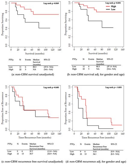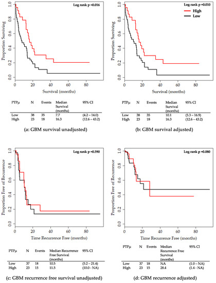 Next, the 61 patients with GBM were analyzed separately to better examine the relationship between survival and PTPµ staining in these patients. Kaplan Meier survival plots for overall survival are shown unadjusted or adjusted for sex, age group, and IDH1 mutation status (Figure 5). GBM patients with PTPµ high staining showed significantly better survival compared to those with PTPµ low staining in both unadjusted (Figure 5a) and adjusted plots (Figure 5b). In contrast, no significant differences were detected between GBM patients with PTPµ low and PTPµ high staining in terms of recurrence-free survival (Figure 5c,d).