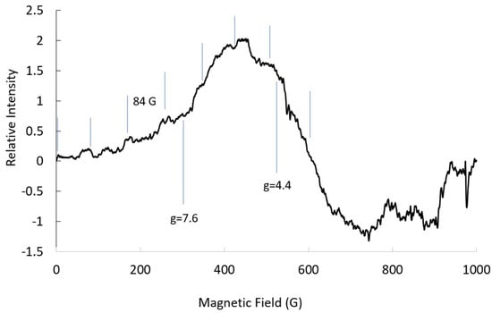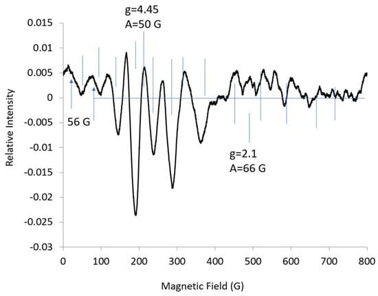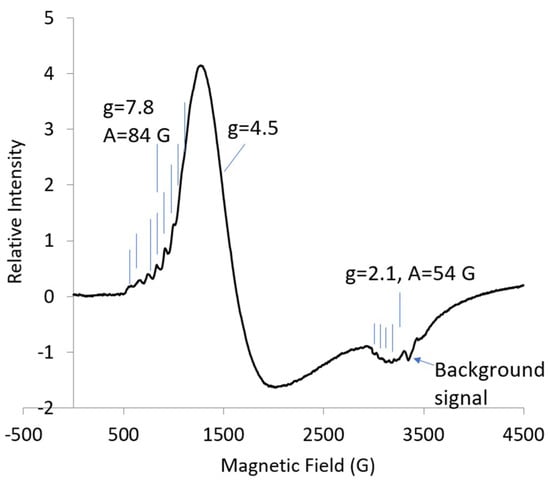 At S-band (3.3 GHz), seven of the Co hyperfine lines for | ± 3/2> were resolved, but the lines were barely detectable when compared to the intensity of the central line for | ± 1/2> (Figure 2). The width of the line for g-mid suggests that the Co hyperfine was about 50 G and the g-crossover was about four. It would be difficult to assign either hyperfine lines or g-values without the parameters from the X-band spectrum. There was little resolution of the Co hyperfine line for geff-mid; the same was similar for other Co sites [].