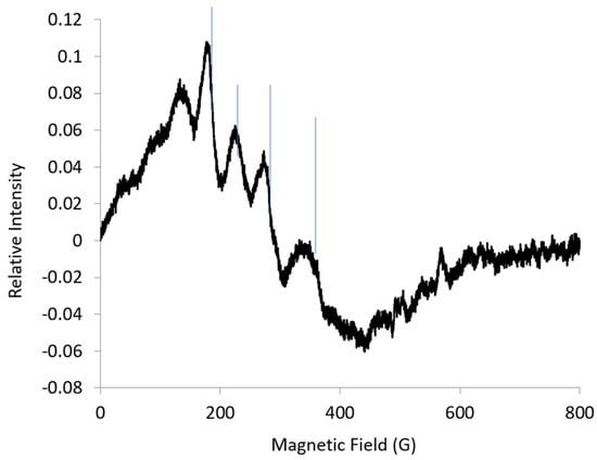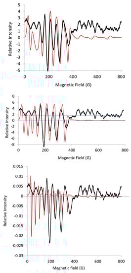 The difference in the spacing between the lines in the EPR spectrum at L-band (Figure 3) can be explained by the rhombic g-values obtained from the L-band simulation; see Table 1. This was consistent with an E/D value of about 0.1, as obtained from the rhombogram []. Looking back at the first harmonic spectrum (Figure 3), the low-field lines marked by arrows have contributions from A-max, but it took simulations of the second harmonic to assign these lines.