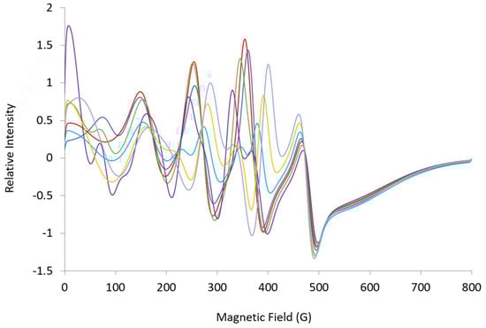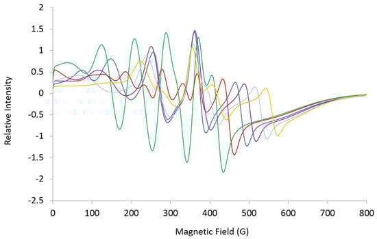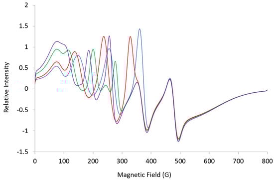 Simulations were completed using an online version of EasySpin []. Some of the simulations come with a warning that there are looping transitions and possible discontinuities at the ends of the spectrum [,].