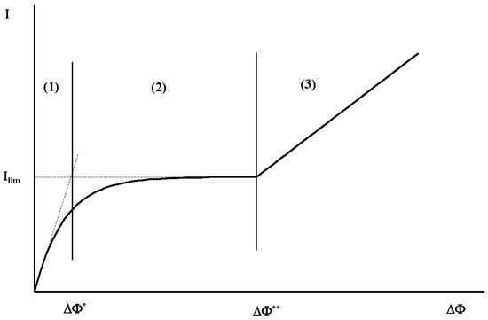 Three regimes are commonly observed in a current–voltage response when a potential drop (∆Φ) is applied normal to the membrane system (see Figure 1). For a small potential drop (region (1)), the ionic conductivity is constant (Ohmic regime). The polarization layer constitutes an electroneutral diffusion layer, over which the concentration gradient is constant, and a quasi-equilibrium EDL. The concentration gradient increases with ∆Φ, which means that the width of the diffusion layer decreases. It follows that beyond a first potential threshold ∆Φ* (region (2)), the conductivity cancels and the current density reaches a plateau (limiting current regime) [24,25,26]. A new layer, called the extended space charge (ESC) region, appears between the diffusion layer and the quasi-equilibrium EDL [12]. The ESC region and the quasi-equilibrium EDL form the non-equilibrium EDL. In the ESC region, the electro-neutrality is not fulfilled. The ESC width increases with ∆Φ. Beyond a second threshold ∆Φ** (region (3)), the non-equilibrium EDL becomes unstable. A longitudinal electric charge gradient, located in this layer, induces an electric and a pressure force along the membrane surface. The enhanced ionic transport leads to an increase in current density [27,28,29,30]. This last regime is called the over-limiting current regime. The diffusion layer is moved away from the membrane and a new layer, called the mixing layer, takes place between the diffusion one and the non-equilibrium EDL. The width of the mixing layer is much higher than the vortex size owing to a plume of small ion concentration in the region of the rising fluid [21,28,31].