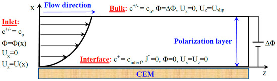 The incompressible fluid motion is described by the Stokes equation (Equation (1)) coupled with the continuity equation (Equation (2)). The ionic transport is governed by the Nernst–Planck equation (Equation (3)) and the electric potential is related to the local ionic concentration by the Poisson equation (Equation (4)):