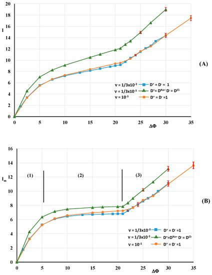where . The expression (14) is equivalent to Equation (3b) in Nikonenko et al. [28] because the cation transfer numbers and are equal to 1 and 0.5, respectively. In Equation (14) is used instead of because the potential drop is imposed over . In the same idea, is the inlet velocity averaged over the computational domain width. This relation gives a value of 9 and 12.4 for the series 1 and 2, respectively. Therefore, it seems from Figure 3 that I is the relevant quantity in the present model.