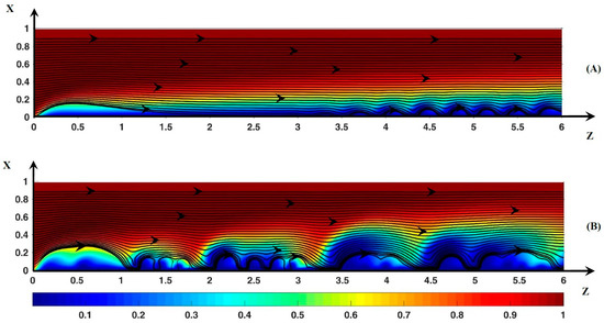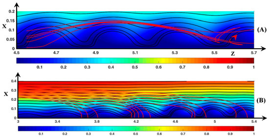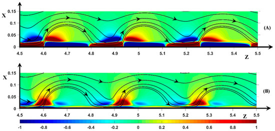 Color plot of: (A) ; (B) . Black lines: static streamlines starting from the inlet. ΔΦ = 22, , .
