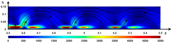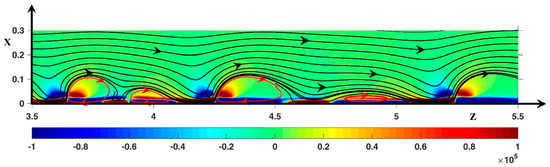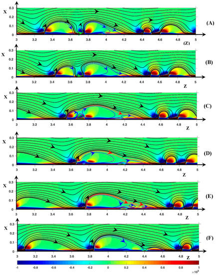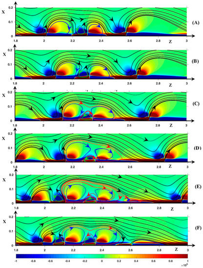 Figure 5 displays the vortices (SSL) and the color map of the two components of the total force , which is the sum of the electric and pressure force . All vortices rotate clockwise. The region of upward fluid motion defines the front of the vortex. Inversely, the region of downward fluid motion defines the rear of the vortex. The space between two successive vortices, i.e., the inter-vortex region, replaces the counter-clockwise vortex in the periodic model. The circumstances in which a counter-clockwise vortex occurs this space will be discussed. The minimum width of the non-equilibrium EDL is located at the rear of the vortex and the hump takes place around the vortex front (upward flow). The two spots of force (Figure 5A) are equivalent to the spots shown in Reference [37] but with a much higher intensity. In these spots, the pressure force is dominant.