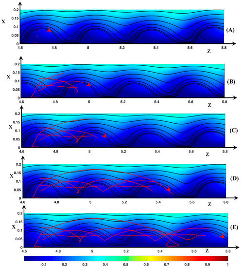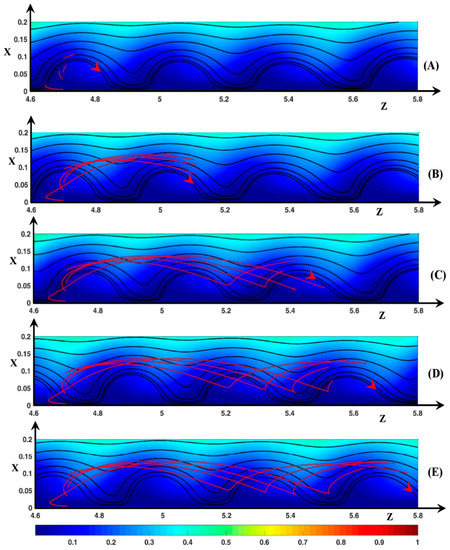 Now if , i.e., upstream of the vortex front, the DSL shape is not always a trochoid because the fluid element can remain inside the inter-vortex region as shown in Figure 11. As an example, let us consider the starting position (, ). The point is located inside the spot. Initially, and . Therefore, as the DSL gets closer to the front vortex, the fluid element begins to move upward, and decreases to a value smaller than (see the discussion about Figure 10). Consequently, at t’ = 35 (Figure 11B), the vertical line defined by (black dashed line) and the DSL meet at (the fluid element is at ). This line moves with the same velocity as the vortices. Therefore, the fluid element passes on the other side of this line and moves towards the membrane with an increasing velocity. Then it enters the spot, so that reaches a value of 85 at t’ = 75 (see Figure 11C). Therefore, the fluid element remains in the inter-vortex region (at t’ = 275 , —Figure 11E). This behavior is observed until xo = 0.065. If , i.e., at the outer edge of the inter-vortex region, the trochoid shape is observed but the DSL does not wind around the same roll. Most of the time, the fluid element moves with and with small enough for the fluid element to enter the rear of the upstream vortex close to the membrane. This is shown for example with in Figure 11C (x = 0.014, z = 4.76). The loop is located at z = 4.8 (Figure 11D). Figure 11E shows that the same fluid element enters the even upstream vortex a second time at t’ = 255 (x = 0.024, z = 5.06). The loop at z = 5 belongs to the trajectory beginning at . Therefore, the inter-vortex is not connected to the diffusion layer and it has a small role in the mixing process.