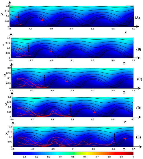 Fluid trajectories. Black lines: static streamlines starting from the inlet. Red lines: dynamic streamlines starting from zo = 4.7 (xo = 0.005, 0.045, 0.075, 0.115). Color plot: cation concentration. The red arrow represents the rotation direction of the vortices and the position of the vortex at time t’ (the trajectories start at t’ = 0 inside this vortex). (A) t’ = 5; (B) t’ = 70; (C) t’ =95; (D) t’ = 195; (E) t’ = 275. ΔΦ = 22, , .